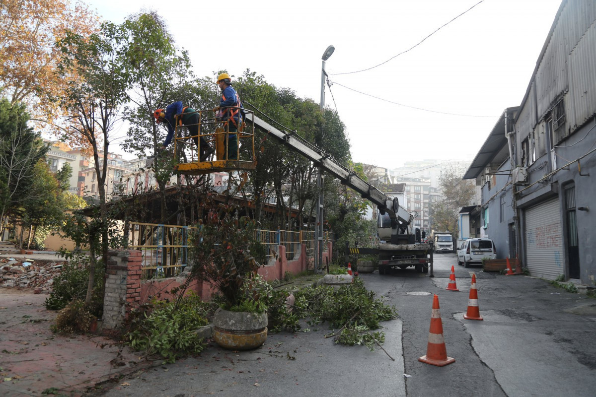 Eyüpsultan Belediyesi'nin uzman ekipleri tarafından güvenlik tedbirleri alınarak gerçekleştirilen budama işlemlerinde ağaçların kuruyan üst dallarını ulaşmak için ise vinçler kullanılıyor.