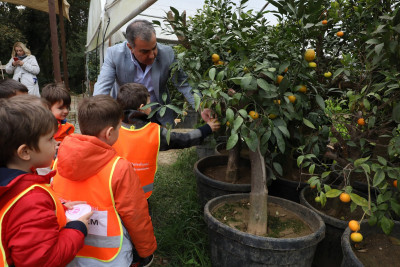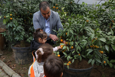 Sonrasında başka bir seraya geçen öğrencilere mandalina ağaçları gösterildi. Öğrenciler burada da dalından mandalina topladılar. Ardından da kendi elleriyle topladıkları mandalinaları yediler.
