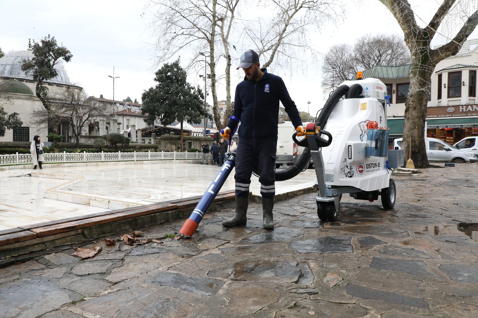 Bu arada ekipler, FİL diye tabir edilen elektrikli süpürge aracıyla meydanı süpürdü.