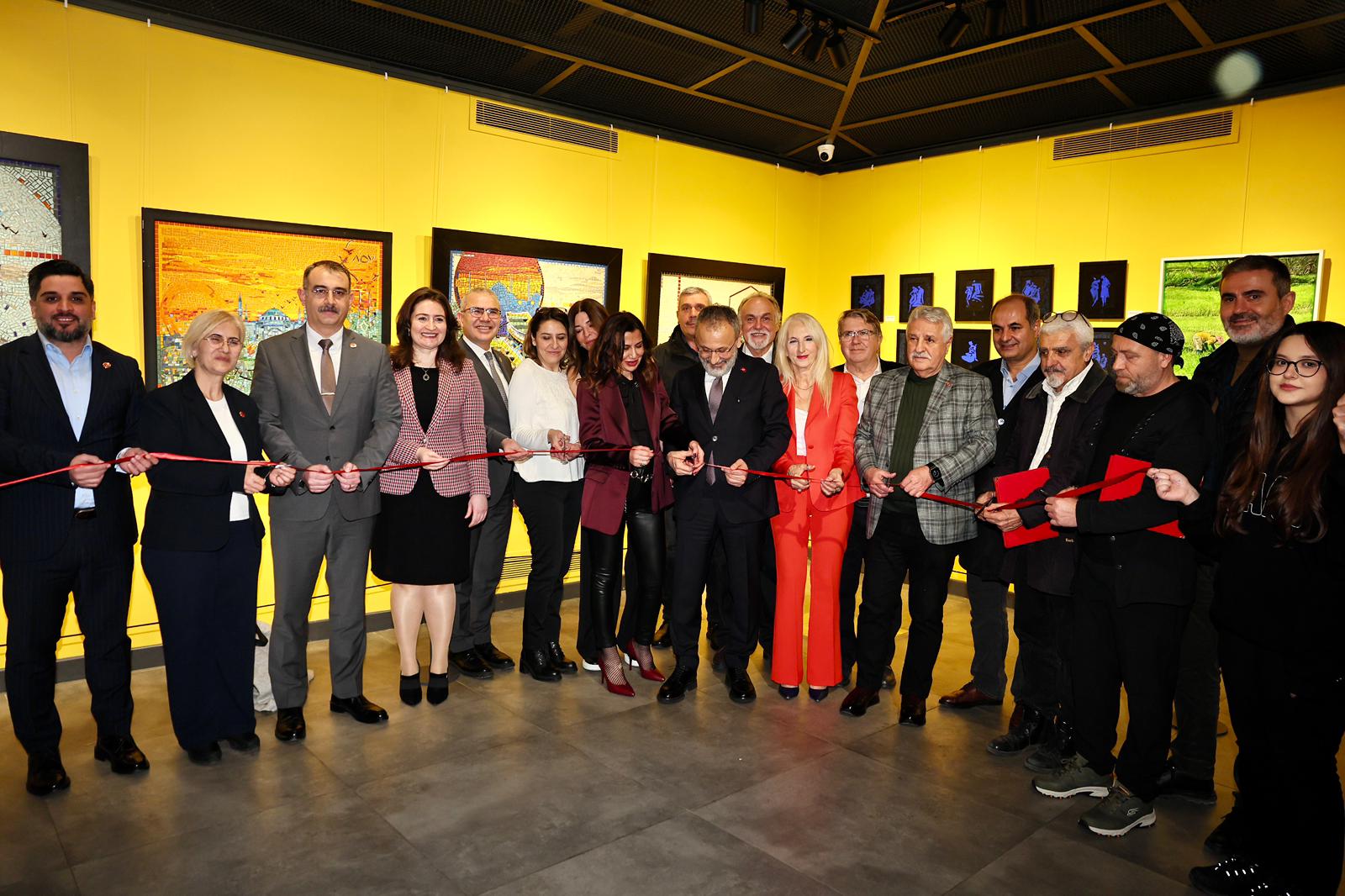 Konuşmaların ardından gerçekleşen kurdele kesiminden sonra Başkan Mithat Bülent Özmen sergiyi gezerek, sanatçılardan eserleriyle ilgili bilgi aldı.